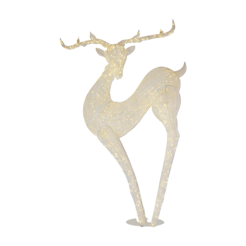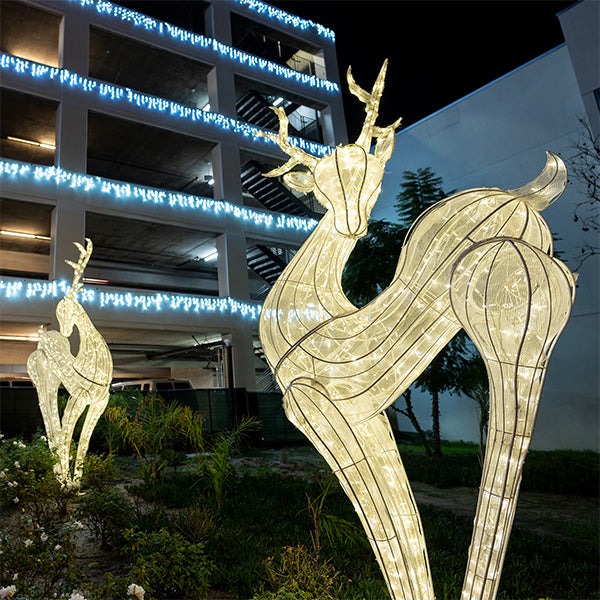 Bring holiday cheer by donning your property with our Sculptured Deer! Constructed with a metal frame and clear netting and filled with bright warm or cool white lights, these deer are ideal for outdoor use and make a stunning display your guests won't want to miss. These giant deer are available in right-facing and left-facing options, perfect for flanking entrances and creating elaborate holiday displays.
